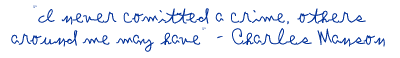 The encoding scheme GIF89a allows you to specify one colour of a GIF image to be transparent. You can thus create transparent backgrounds which allow images on your webpages to "float" on the page because the backgound colour of the page will show through the image. You can also use this technique to create titles or to import special fonts onto your webpage. The example below is a sample of Charles Manson's handwriting displayed as a transparent gif.[Quotation from Killer Fonts]